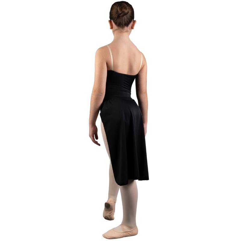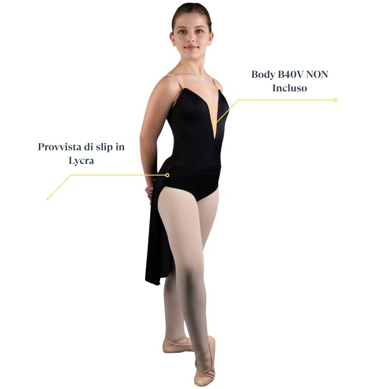 La gonna ha un taglio asimmetrico che crea un effetto fluido sul palco, mentre lo slip integrato in lycra mantiene il capo fermo e pratico durante l’esecuzione.